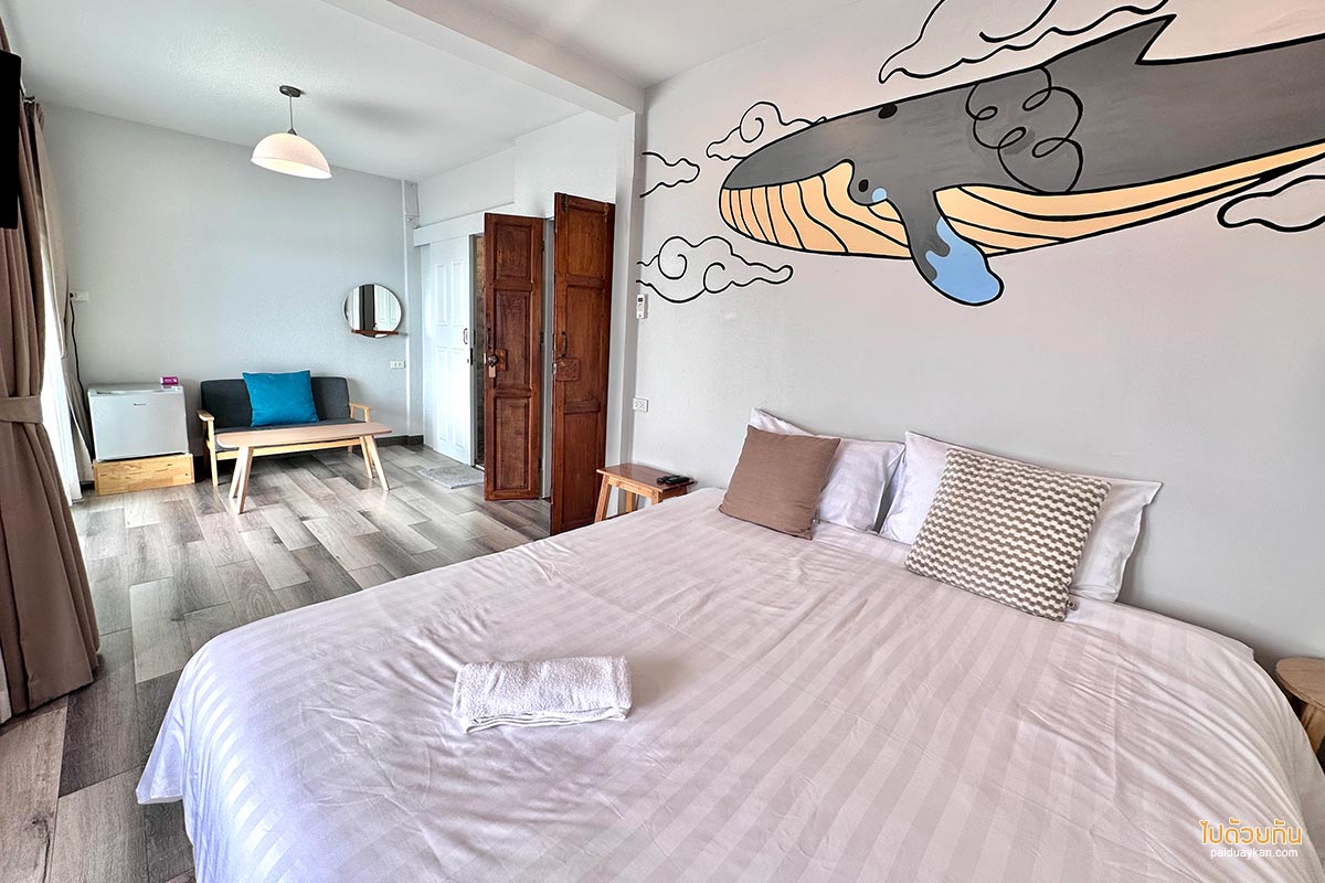 ห้องซีวิว เป็นห้องที่เราเลือกพัก ราคาห้องละ 1500 บาท พักได้ 2 คน รวมอาหารเช้าข้าวต้ม ตั้งอยู่ชั้นสองของบ้าน มองเห็นวิวทะเลสุดลูกหูลูกตาได้จากในห้อง ห้องโทนสีขาว มีแสงส่องผ่าน มองแล้วคลีนตา ห้องสะอาด กว้างขวาง มีเตียงนอนขนาดใหญ่ โซฟานั่งเล่น ทีวี ตู้เย็น ห้องน้ำในตัว ชอบหัวเตียงนอนมีภาพเพ้นท์ปลาโลมาสุดน่ารักที่ช่วยเพิ่มสีสัน เป็นห้องเดียวที่มองเห็นวิวทะเลจากห้องโดยที่ไม่ต้องเดินไปยังพื้นที่ส่วนกลาง